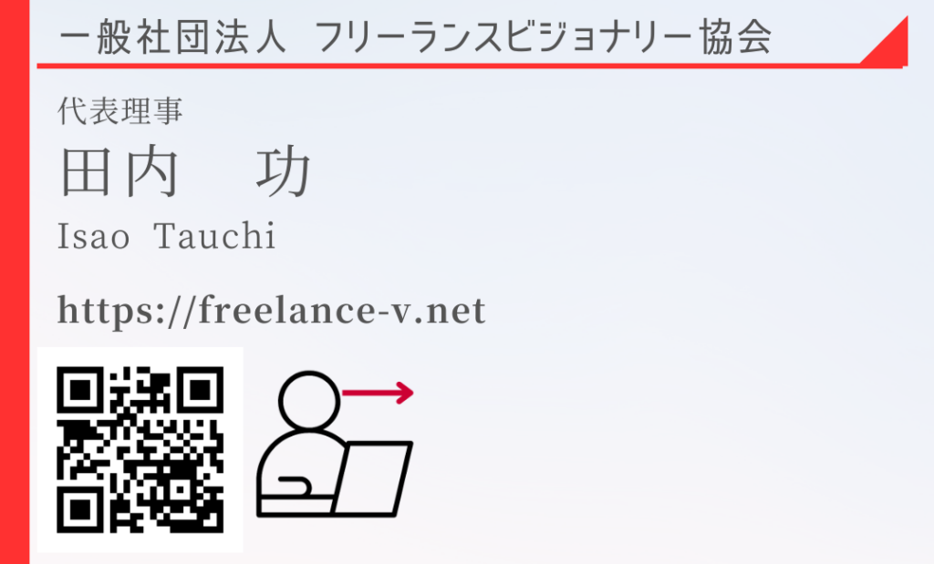 • 一般社団法人フリーランスビジョナリー協会 代表理事 田内功(たうち いさお) 名刺
